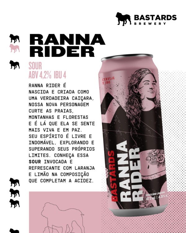 Nascida e criada como uma verdadeira caiçara, Ranna Rider curte as praias, montanhas e florestas e é lá que ela se sente mais viva e em paz. Seu espírito é livre e indomável, explorando e superando seus próprios limites. Essa é a Ranna Rider, uma sour refrescante, de corpo leve com adição de limão e laranja para compor essa acidez.